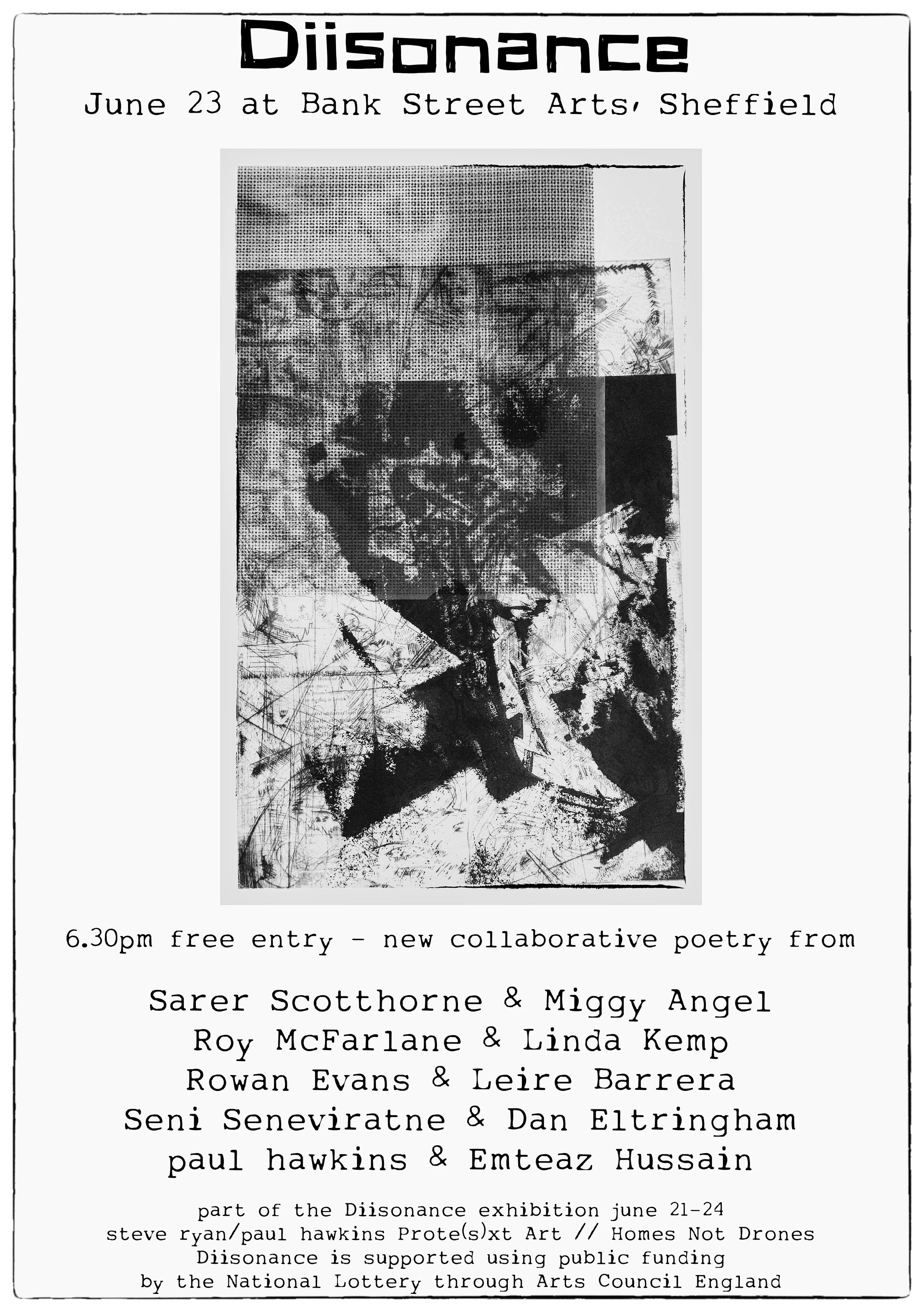 Diisonance contains artworks by Steve Ryan & paul hawkins, as well as new, collaborative & experimental poetry by Sarer Scotthorne, Miggy Angel, Andrew Jeffrey, Janine Ellul, Roy McFarlane, Linda Kemp, Passy Kulmisli, Rowan Evans, Leire Barrera, Dan Eltringham, Seni Seneviratne, Emteaz Hussain, paul hawkins, George Askwith, Vertaa Lune, Maachouq Hamza, & Mark Wood.